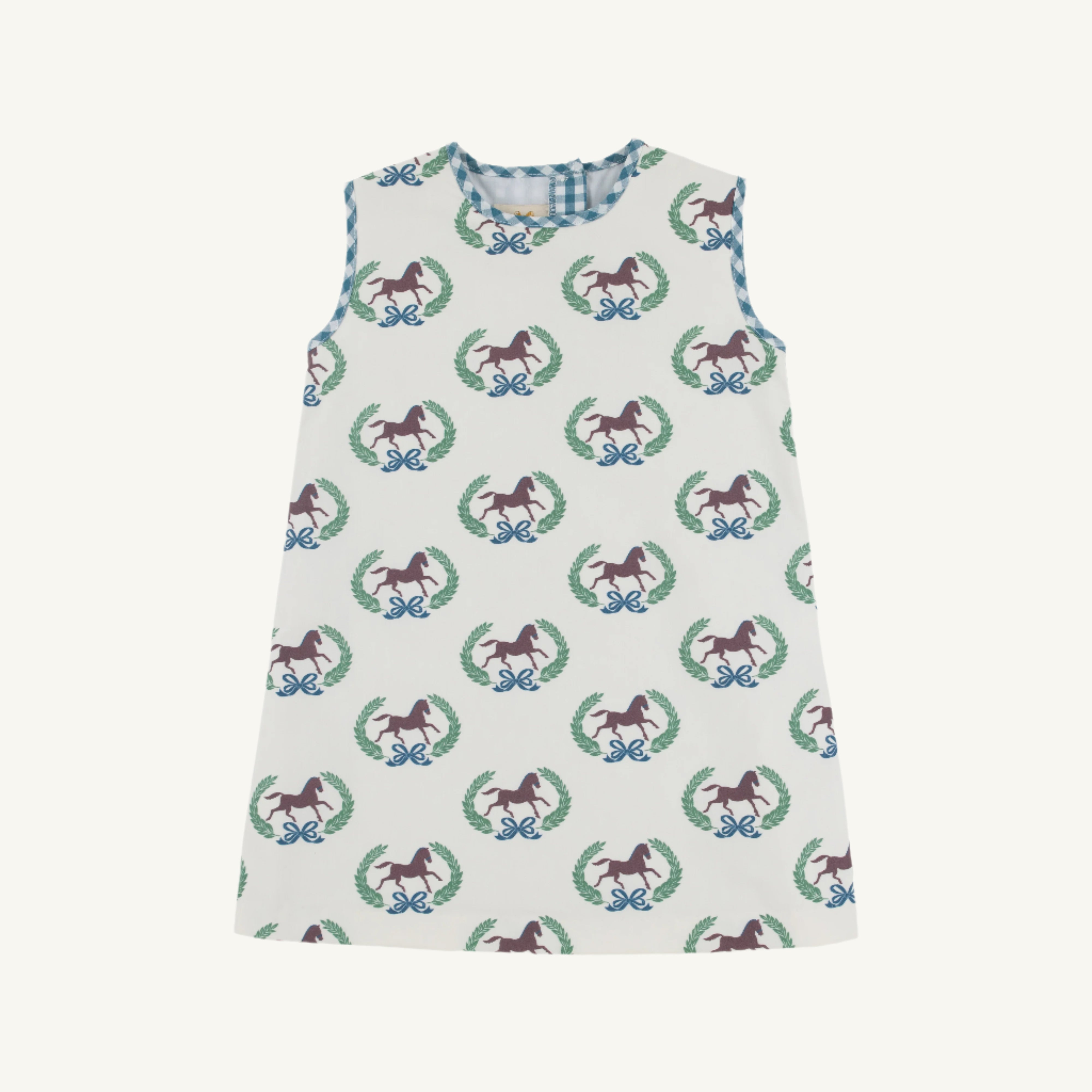 Our Annie Apron Dress is a favorite of ours, and we know it will be yours too! Your little lady will look oh so sweet in this fall piece featuring Highland Horses with Barnsley Blue Gingham!