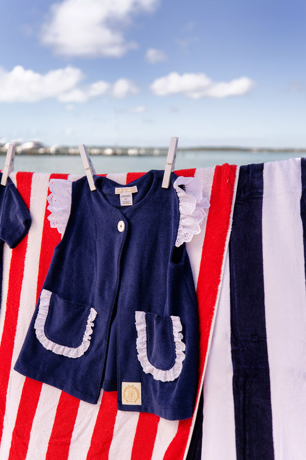 The Callie Cover Up in our new Nantucket Navy Terrycloth fabric with Worth Avenue White detailing is the perfect addition to any bathing suit. Your little girl will fall in love with the ruffle sleeves and pockets.