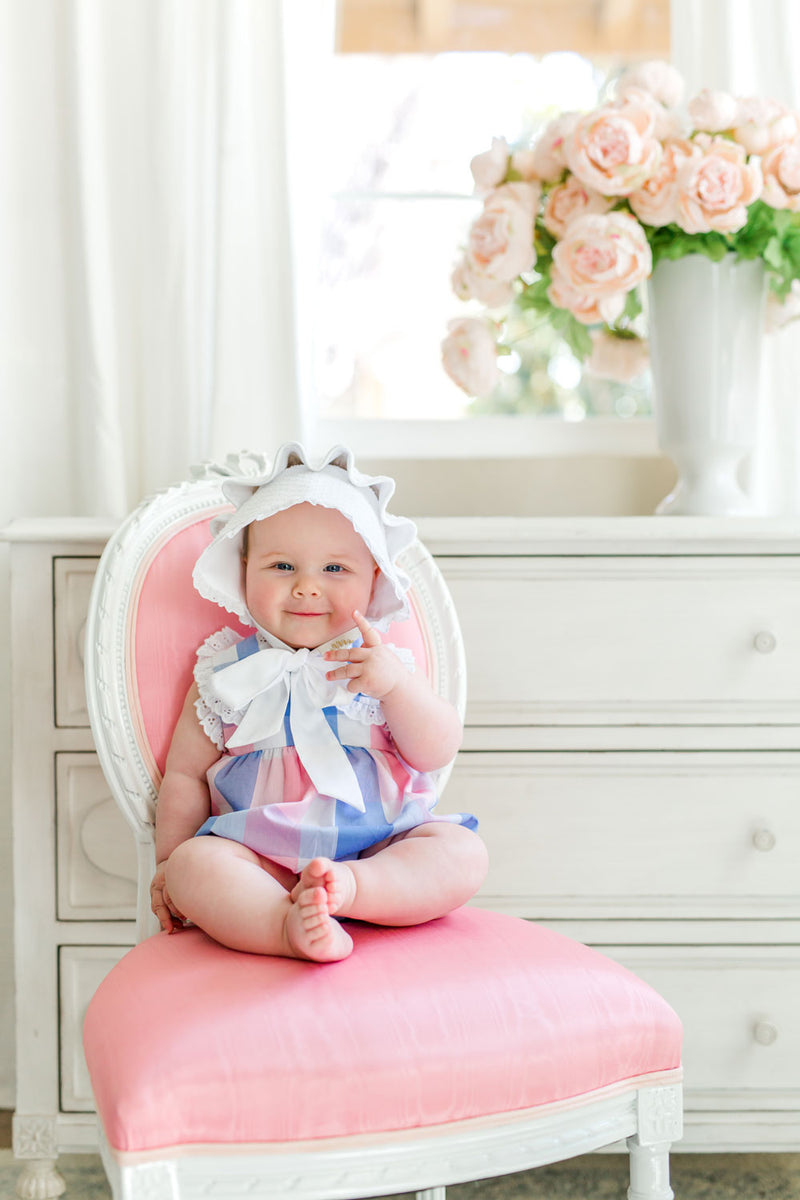 The Bellefaire Bonnet in Worth Avenue White Dallas Dot is a fancier version of the Beaufort Bonnet, featuring an eyelet-trimmed brim and reversible crown lined in crisp Worth Avenue White broadcloth. This versatile bonnet transitions beautifully from Easter celebrations to poolside fun, making it a year-round favorite. A beloved classic that adds a touch of elegance to every occasion!