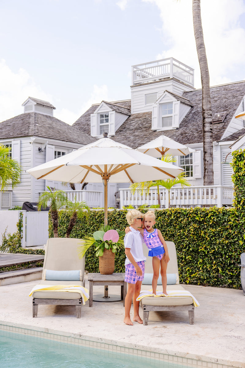 Our Bridgehampton Bathing Suit... the swimsuit that's sure to leave everyone asking where you bought it! Featuring Wilmington Waters with Rockefeller Royal Micro Dot, this is the suit of the summer!