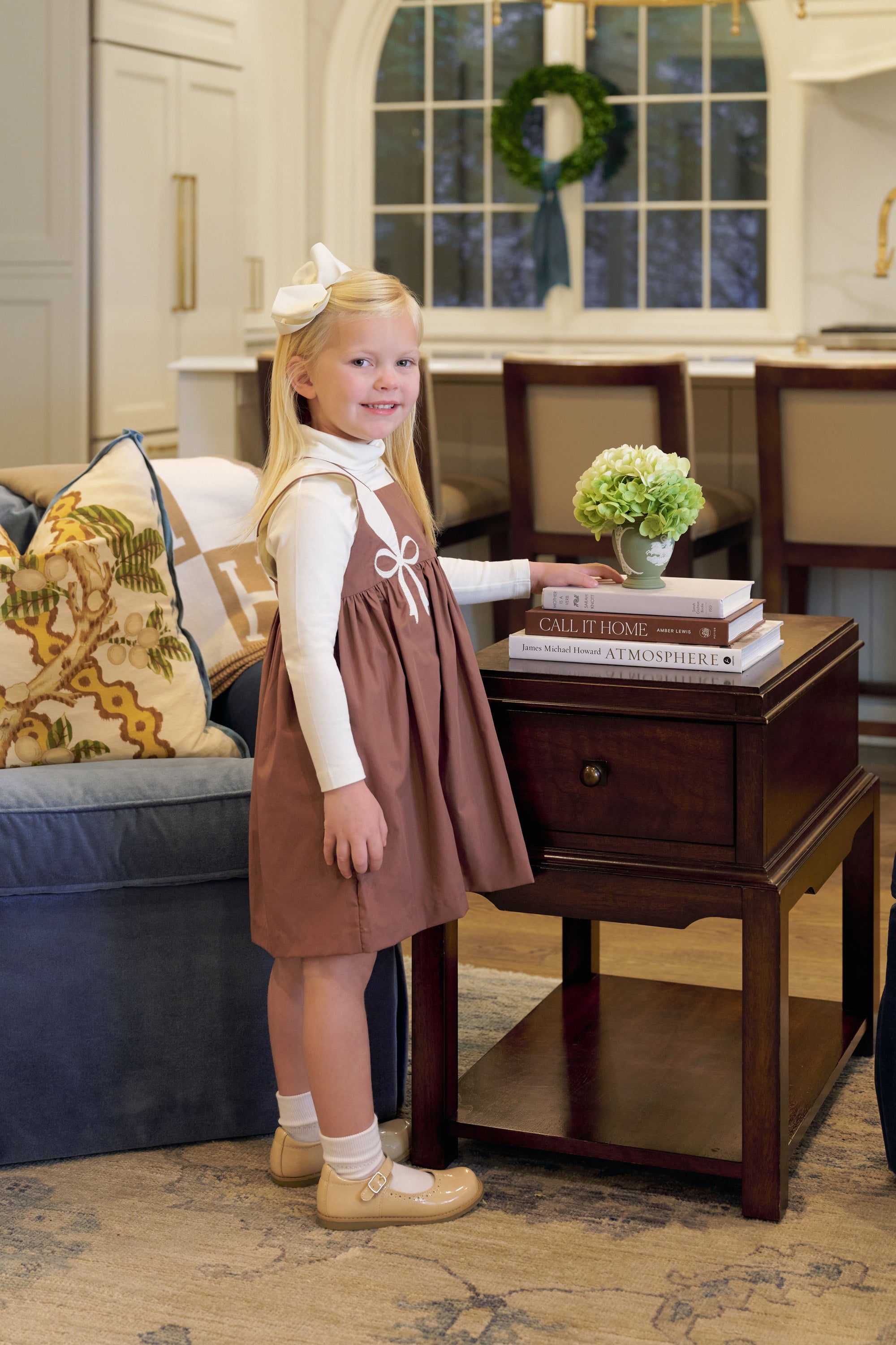 Our Demi Dress is a favorite this fall! Featuring Gray Bay Brown with Palmetto Pearl and the sweetest bow embroidery, we're sure every little lady will love this dress!