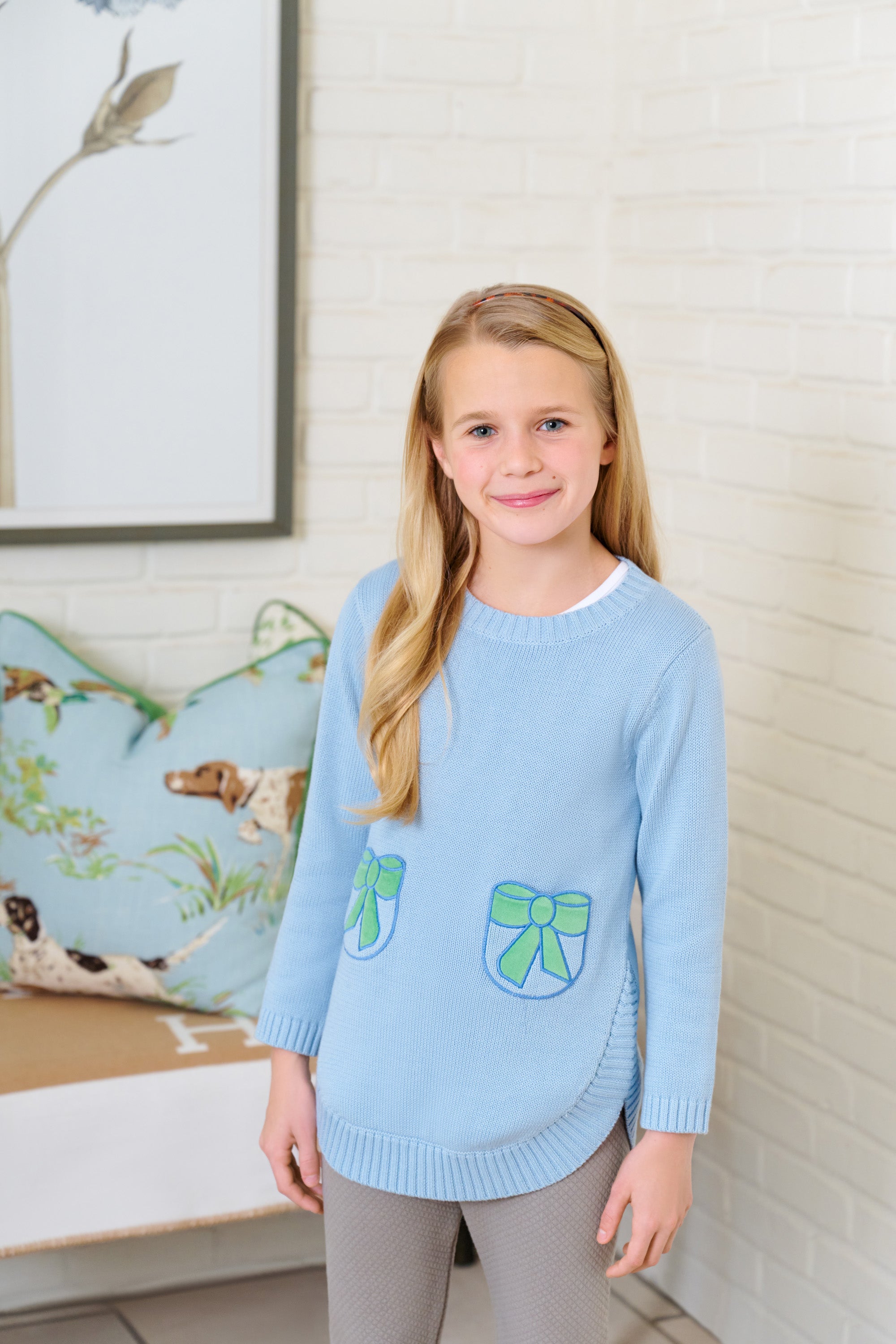 Our Terrell Tunic is cuter than ever! Featuring Barrington Blue with Kiawah Kelly Green velveteen bow pocket detailing, this tunic is just darling and perfect for everyday wear.