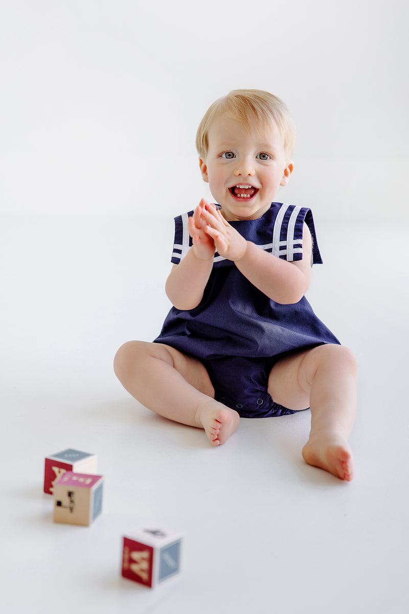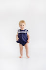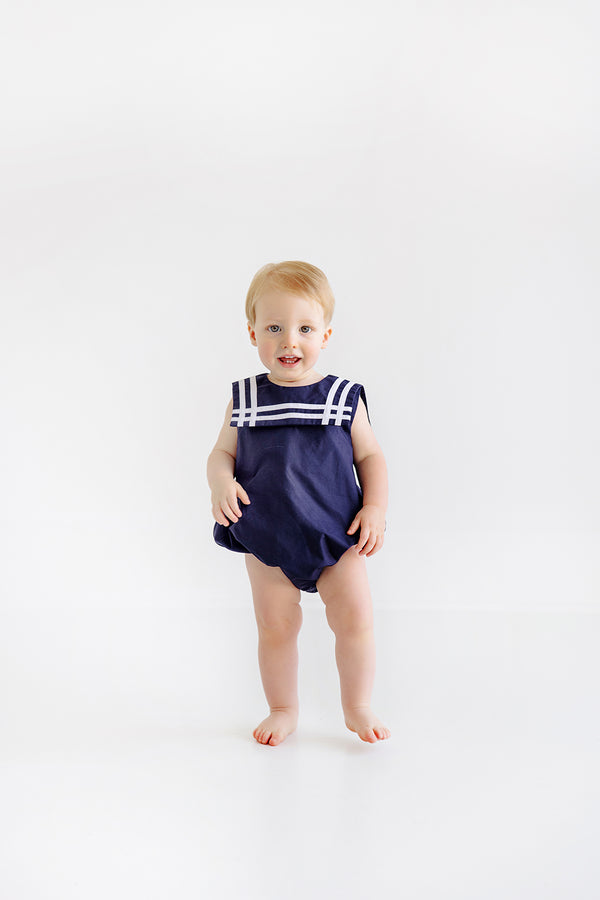 The Sleeveless Townes Top Sail Bubble was made for your little sailor! Featuring Nantucket Navy and Worth Avenue White, this bubble was made for their nautical ventures.
