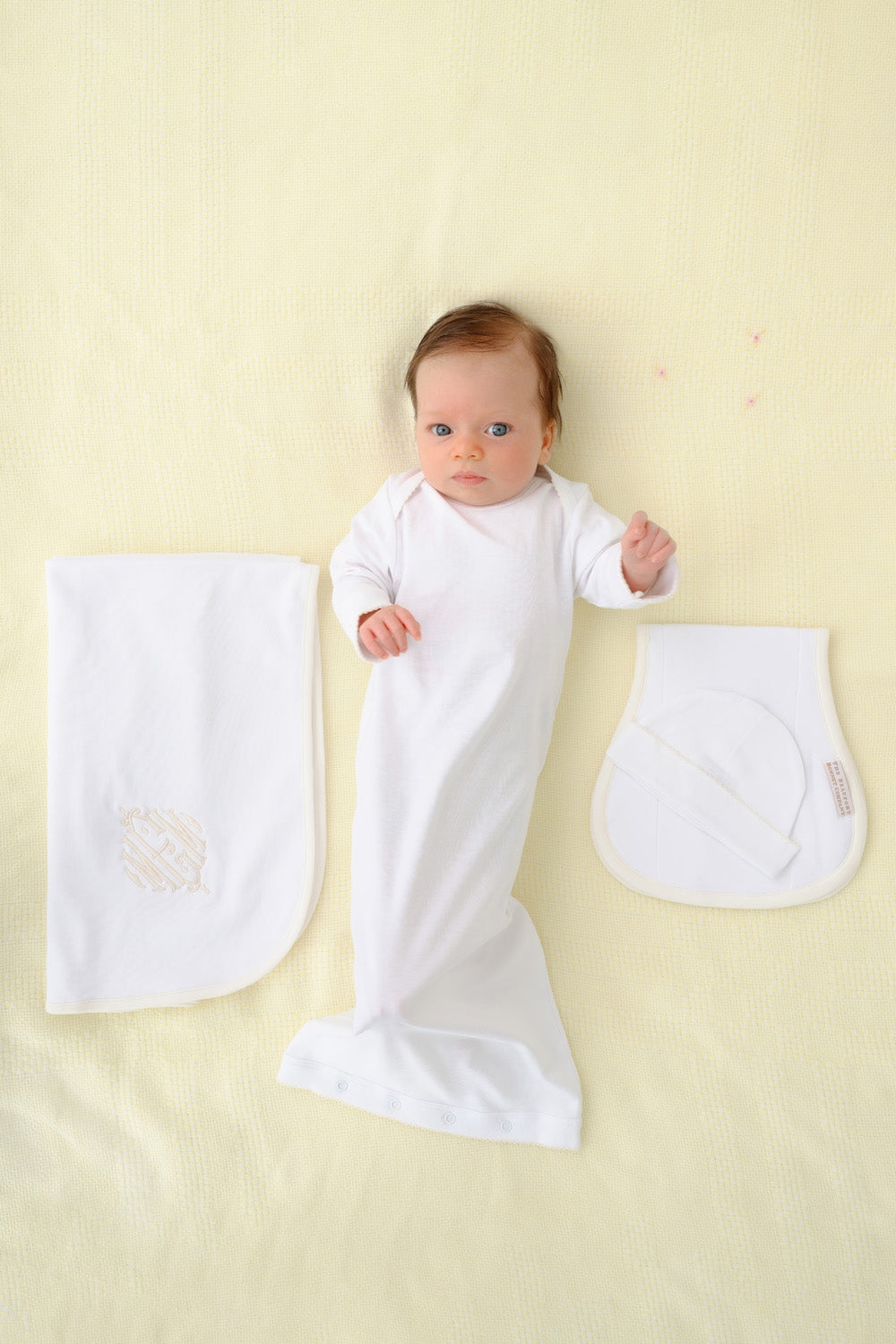 The Darling Debut Gift set includes The Oopsie Daisy Burp Cloth, Baby Buggy Blanket, gown, and hat. Every baby should look darling when making their big debut. First impressions count! We pinky promise baby will love this set as much as you- it's pure Peruvian Pima Cotton perfection. MWAH!