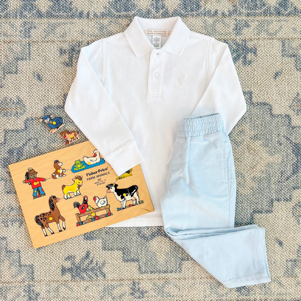 Our Long Sleeve Prim & Proper Polo in Worth Avenue White with Multicolor Stork is perfect for your dapper little gent. You'll be reaching for this one all season long. Regardless of the occasion, your little man will look as sharp as can be when he's wearing this polo.