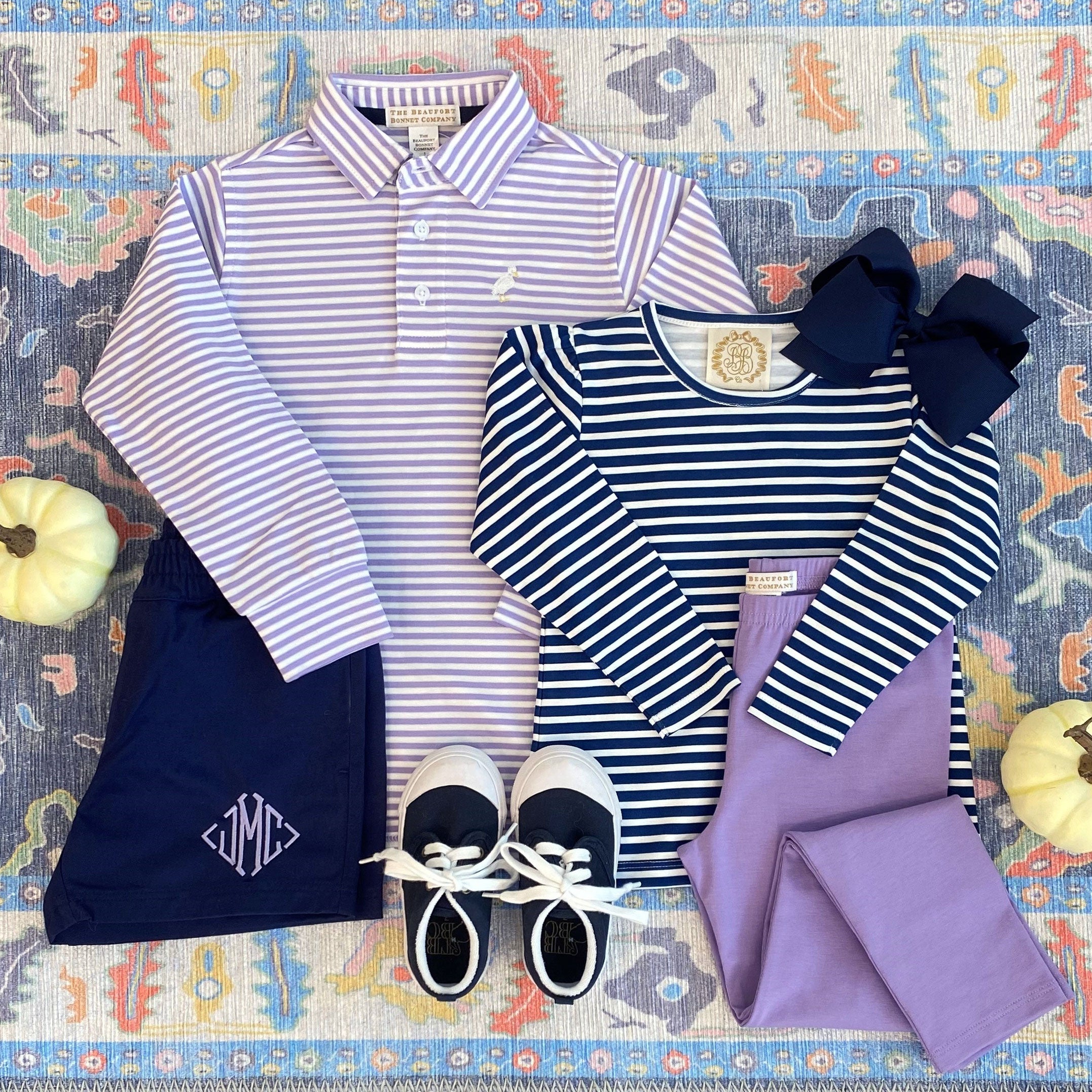 Sheffield Shorts are a little gent wardrobe staple; he'll probably need several. Since 'preppy and practical' is the name of the game- the elastic waist makes diaper changing and potty training a little easier. These classic navy chino shorts are monogram friendly.