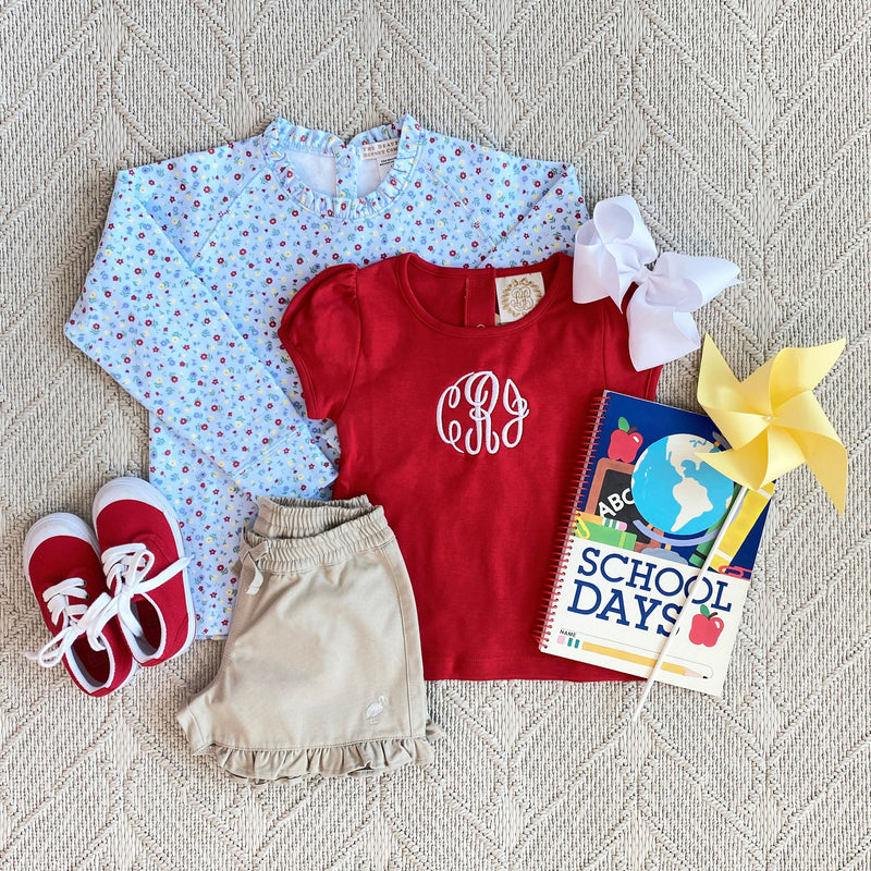 Our Shelby Anne Shorts in Keeneland Khaki with Keeneland Khaki Stork are sure to be your little girl's new favorite shorts. You'll fall in love with the ruffle details!